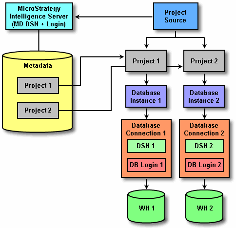 The diagram shown above illustrates projects that connect to only one data source. However, Strategy allows connection to multiple data sources in the following ways: