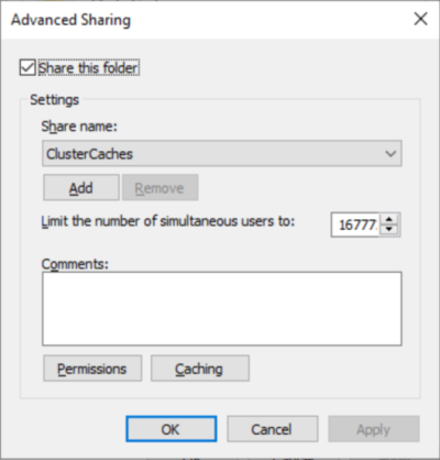 On the machine that is storing the centralized cache, create the file folder that will be used as the shared folder. The file folder name must be identical to the name you specified earlier in Cache file directory. This is shown as the