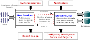 It is important to understand that the Strategy business intelligence system has a limited capacity. It cannot serve an unlimited number of users and process an unlimited number of jobs in a short time. This capacity can be thought of as a box shared by the two important goals of serving the necessary number of user sessions (through which users submit requests) and maximizing the number of jobs executed (which return results).