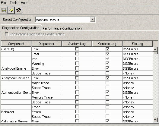 The Strategy Diagnostics and Performance Logging tool configures which diagnostic messages are recorded to Strategy log files. You can customize the logging options to gather information from more or fewer system components and performance counters, and to save log messages to different log files.