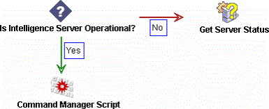 - Failure: The red arrow, in the middle, is the failure connector. If the current process is completed with an exit code that is defined as a failure status, the process that the failure connector points to is the next process that is attempted. If you use a failure connector from a process, it is recommended that you also provide a success connector.