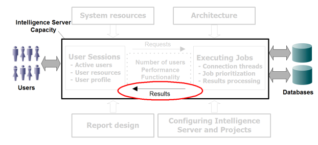 After Intelligence Server processes the results of a job (see Manage Job Execution), it then delivers the results to the user. In a three-tier system, results delivery uses very little of the system resources. Most of the tuning options for results delivery are focused on a four-tier system involving Strategy Web.