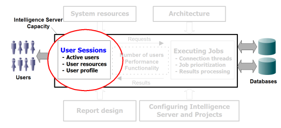 Each user connection from a Strategy client (Web, Developer, Narrowcast Server, and others) establishes a user session on Intelligence Server. Each user session consumes a set amount of resources on the Intelligence Server machine and can consume additional resources depending on the actions that the user takes while they are connected.