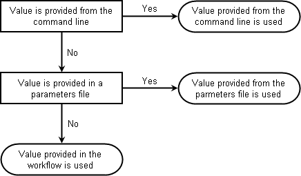 - If the value for a parameter is provided from the command line during execution, this value is used. Any values for the parameter provided in a parameters file or default values provided in the workflow are ignored.