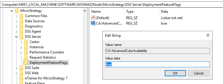 Computer\HKEY_LOCAL_MACHINE\SOFTWARE\WOW6432Node\MicroStrategy\DSS Serverkey, add a newDeploymentFeatureFlagskey, if it does not already exist. -