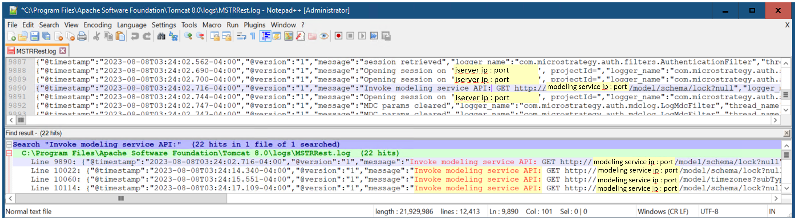 The Modeling service IP and port appears in /Apache Software Foundation/Tomcat x.0/logs/MSTRRest.log.