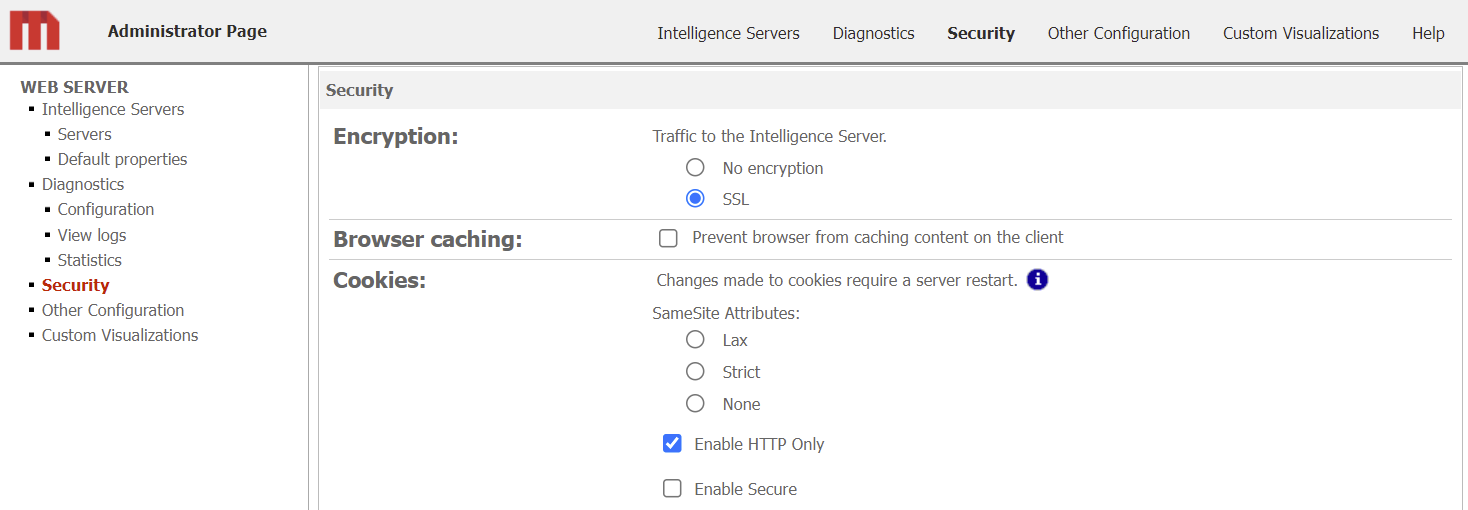 Starting in MicroStrategy 2021 Update 7, you can manage SameSite cookies for Strategy Web and Mobile in the Strategy Web and Mobile Administrator pages, respectively. See Configure the SameSite Flag for Strategy Deployments for managing SameSite cookies in MicroStrategy 2021 Update 6 and older. Strategy