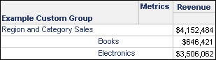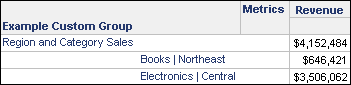 - Display element names from only the first attribute in the joint element: Displays only one attribute element for the attributes that are included in the filter qualifications for the custom group element. An attribute element from the attribute that is first in terms of alphabetical order is displayed for the custom group. For example, the attributes Region and Category are used in separate filter qualifications, which are then used to create a custom group element. When this custom group is included in a report, the Category attribute element is displayed for the custom group elements, as shown in the report below.