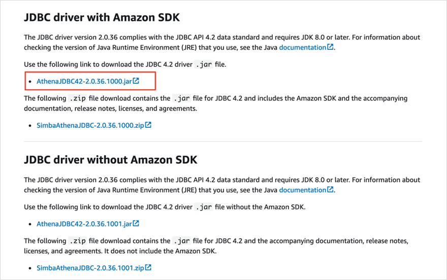 The Amazon Athena JDBC driver is not installed with Strategy. Therefore, you must download the driver.