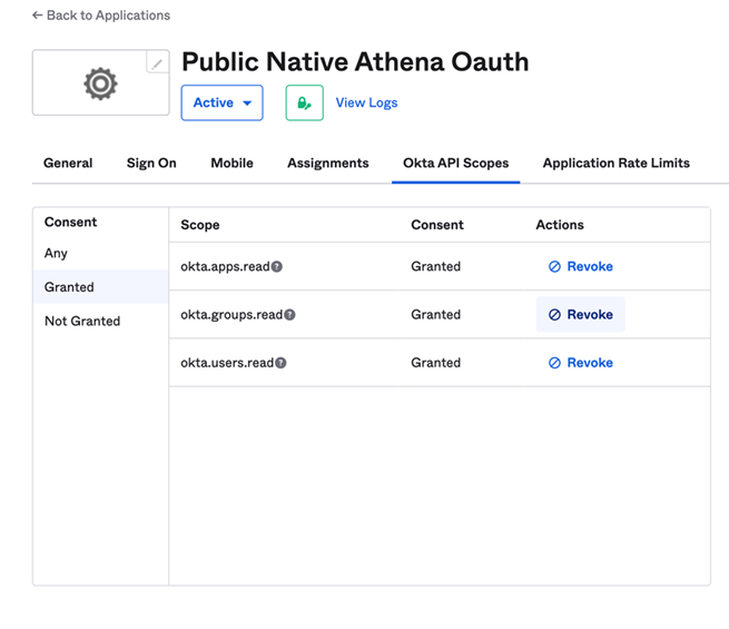 Click Grant next to the okta.apps.read, okta.groups.read, and okta.users.read scopes.
