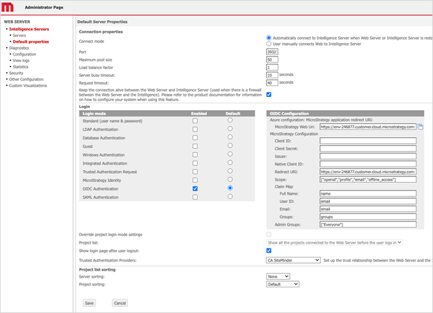 In MicroStrategy 2021 Update 2 or later, the Web admin pages support OIDC and basic authentication when OIDC authentication is enabled. The admin pages authentication is governed by the springAdminAuthMethod parameter located in the WEB-INF/xml/sys_defaults.properties file.