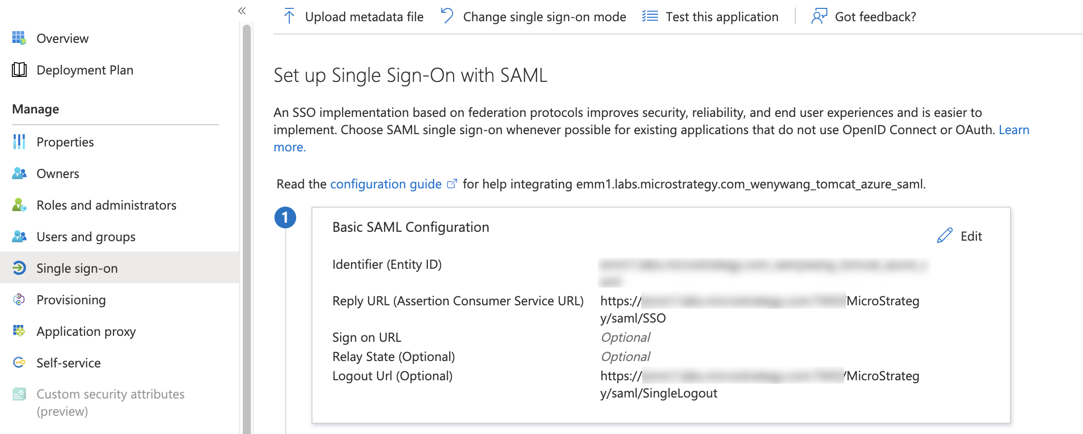 Enter the necessary information in the Azure console as shown in Integrating SAML Support with Microsoft Entra ID (Formerly Azure AD).