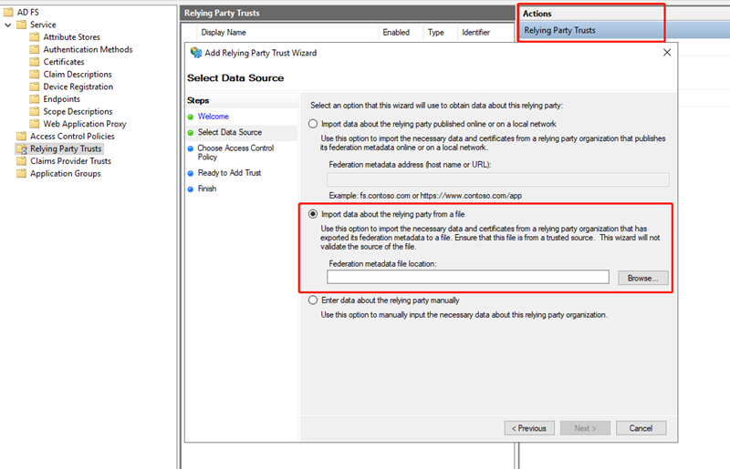 In the Select Data Source pane, select Import data from the relying party from a file.