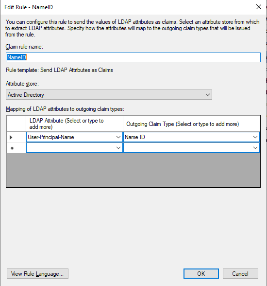 One by one, add the claim rules and complete the setup on ADFS. The following are examples of rule creation and a list of created rules. In this example, the same claim rule is created as specified in the following screenshot.