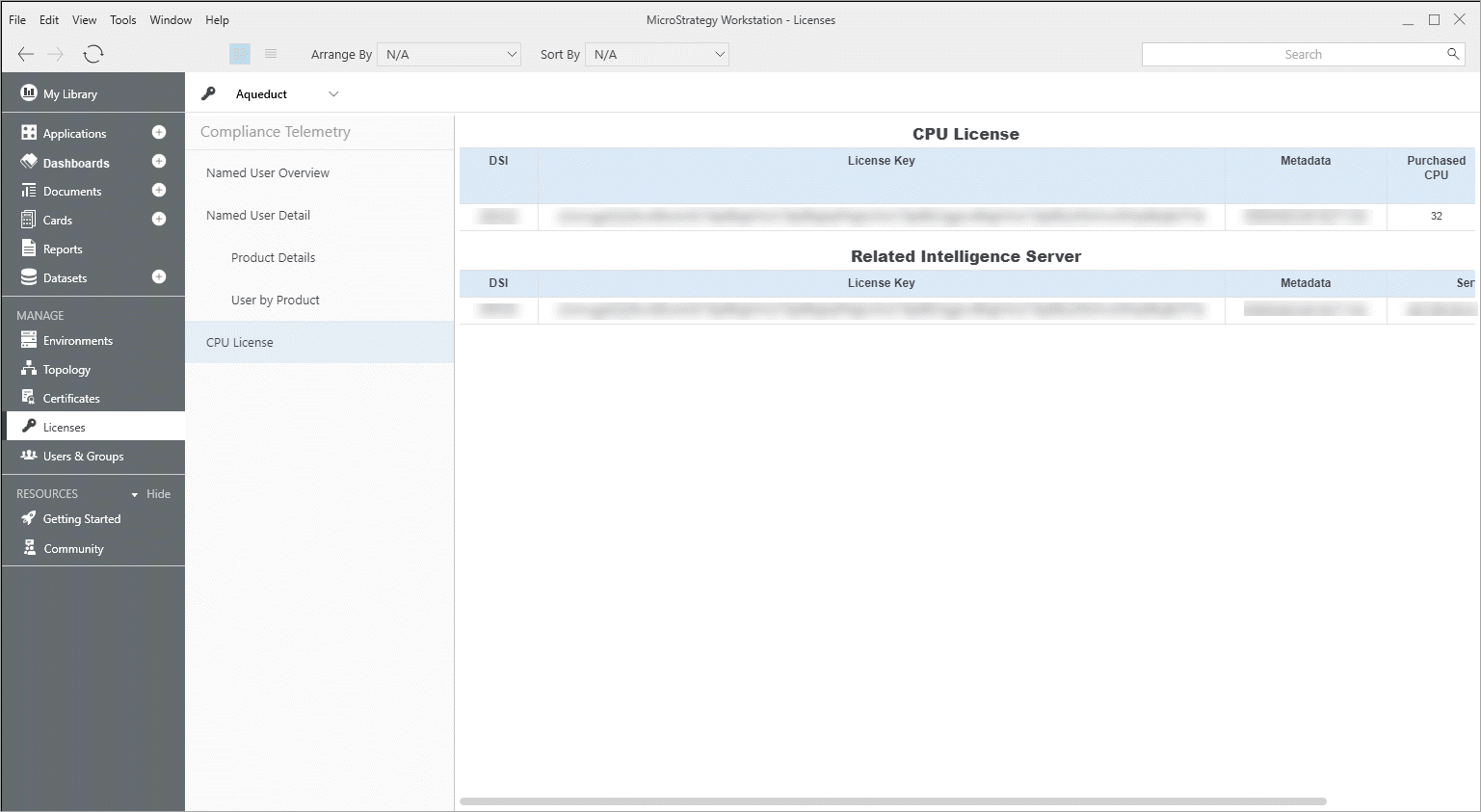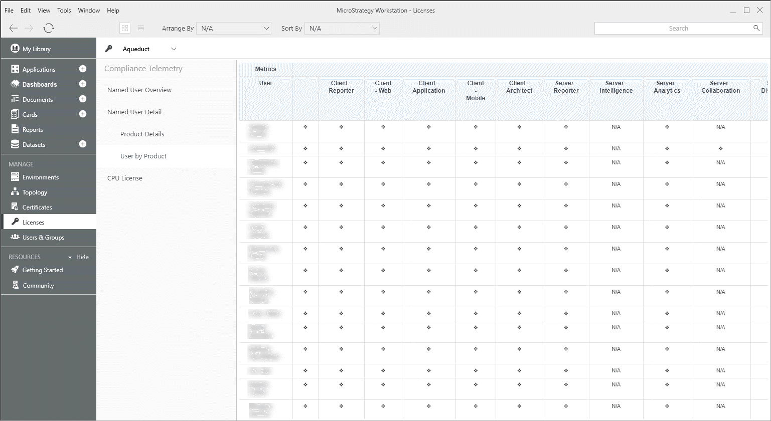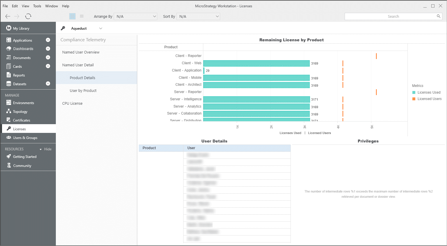 Administrators can monitor system and product usage to ensure Strategy contract compliance. The embedded dashboard in the Licenses section of the Workstation window contains information about the licenses and related privileges currently being used across your Strategy environment.