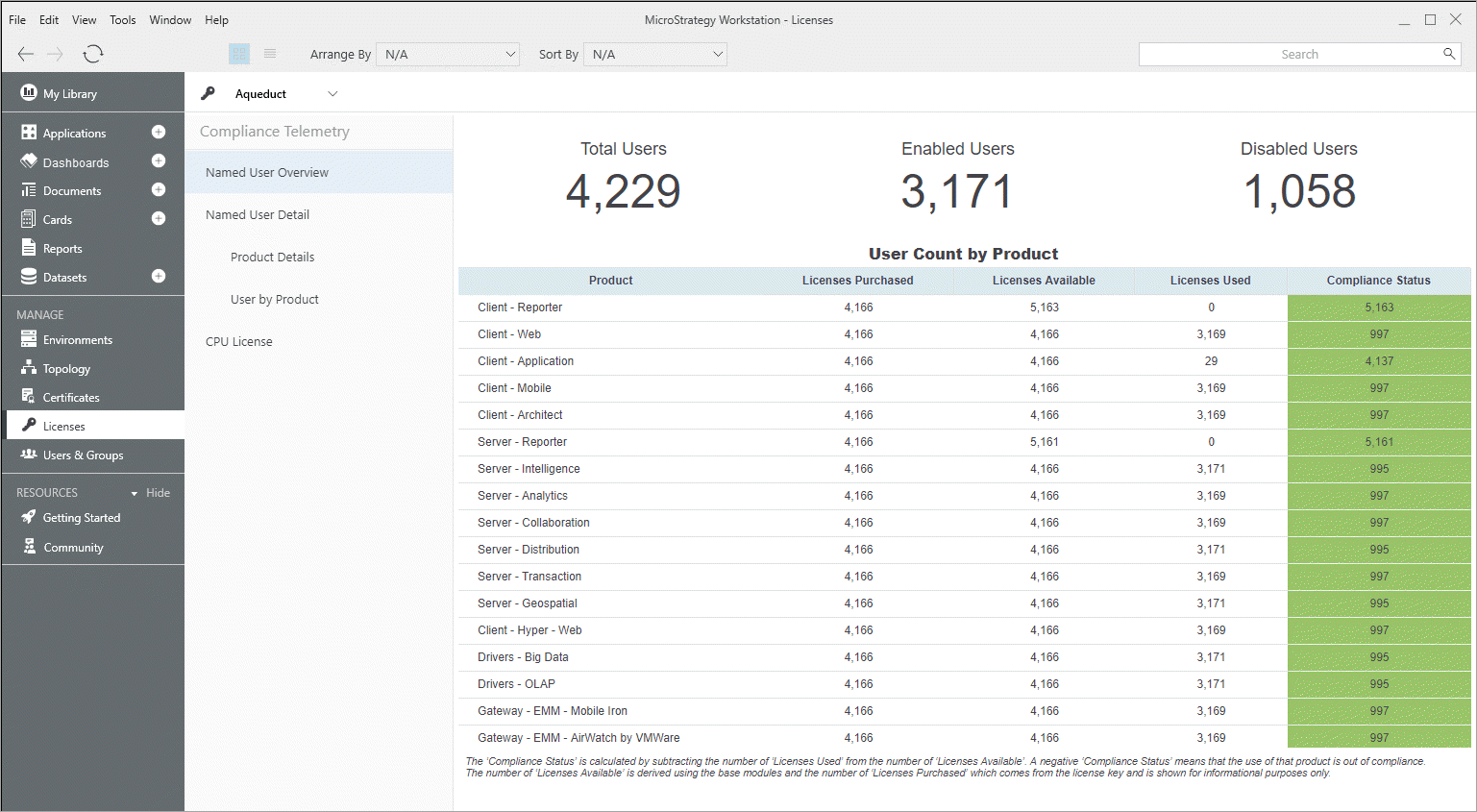 The Named User Overview chapter provides a summary of environment, account, and product and license information. Pre-formatted thresholds applied to the Compliance column make out of compliance usage instantly recognizable. Reporter and Intelligence are represented in independent sections to help quickly pinpoint issues.