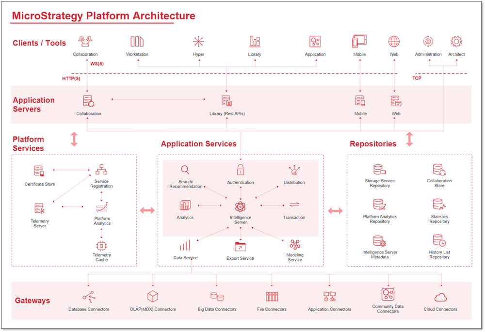 A business intelligence platform offers a complete set of tools for the creation, deployment, support, and maintenance of business intelligence applications. Some of the main components of the Strategy platform include: