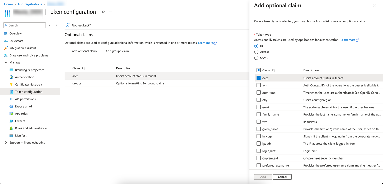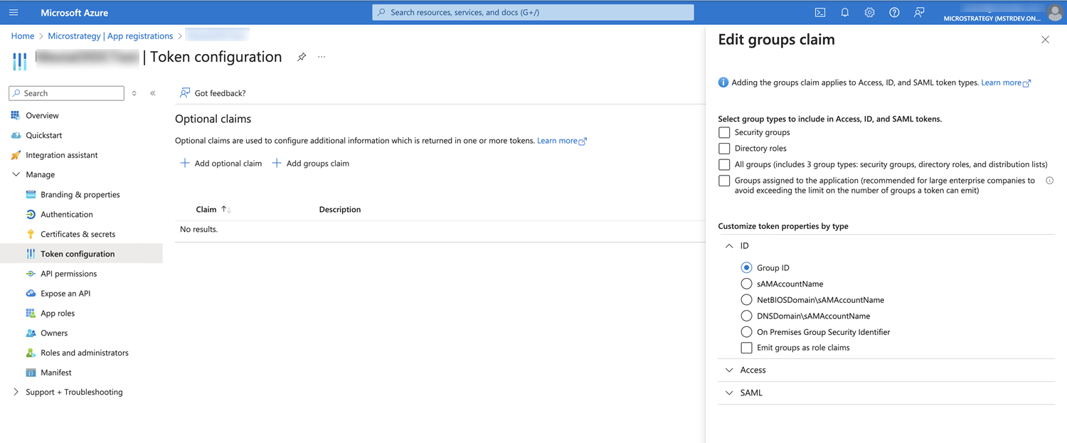 Add group claims by choosing Token configuration > Add group claims > ID and save the defined group claim.