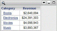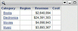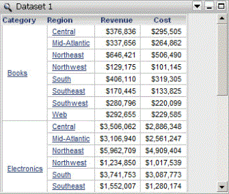 For example, a document contains two datasets. Dataset 1 has Category, Region, and the Revenue and Cost metrics. Dataset 2 has Category, Subcategory, and the Revenue and Profit metrics. A Grid/Graph containing the objects from Dataset 1 is displayed on the document. A portion of the Grid/Graph is shown below, in Interactive Mode in Strategy Web: