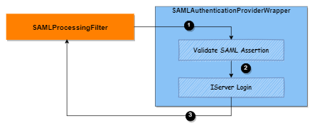 To verify SAML 2.0 responses, SAMLProcessingFilterWrapper delegates authenticate work to SAMLAuthenticationProvider. It authenticates a user based on information extracted from SAML assertion and logs into the Intelligence server by calling the internal login method.