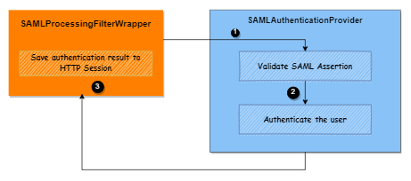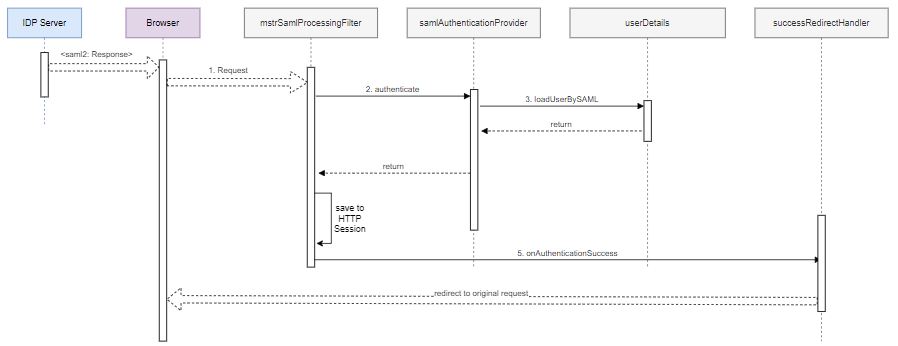 mstrSamlProcessingFilterSAML processing filter bean extracts the SAML assertion from the request and passes it to thesamlAuthenticationProviderauthentication provider bean. -