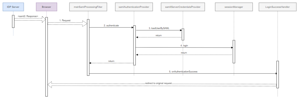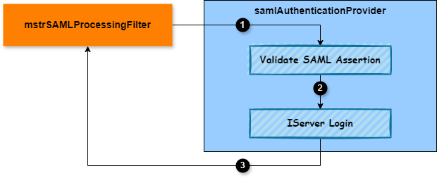 mstrSamlProcessingFilterSAML processing filter bean extracts the SAML assertion from the request and passes it to thesamlAuthenticationProviderauthentication provider bean. -