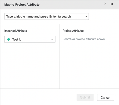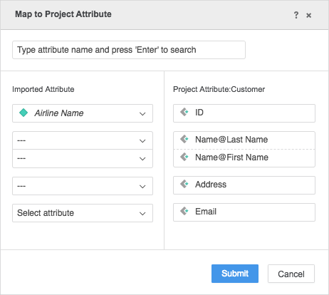 The imported attribute appears in the left pane. The project attribute name appears at the top of the right pane. The corresponding attribute forms appear beneath it. The ID attribute form is always required. Other forms are optional. Some forms must be added together, such as Name@Last Name and Name@First Name or Latitude and Longitude. If this requirement is not met, the Submit button is disabled. Refer to the tooltip to see why the button is disabled.