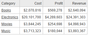 Specifically, metrics define the analytical calculations to be performed against data that is stored in the data source. A metric is made up of data source facts and the mathematical operations to be performed on those facts, so that meaningful business analysis can be performed on the results. A metric on a report, document, or dashboard shows a list of values used for analytical calculations. For example, the report shown below contains the Cost, Profit, and Revenue metrics, with values displayed for each Category.