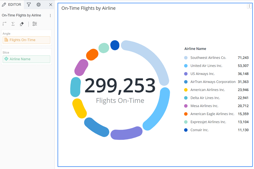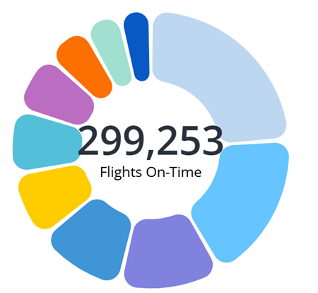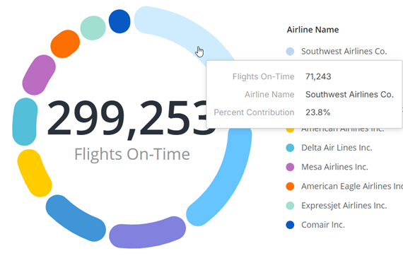 To view the exact values of a segment by hovering your cursor over it. Knowing the exact contribution can guide resource allocation, identify outliers, or highlight opportunities for improvement. In the example below, the airline name, number of on-time flights, and percent contribution display in a pop-up. This speeds insight discovery especially if the legend is hidden.
