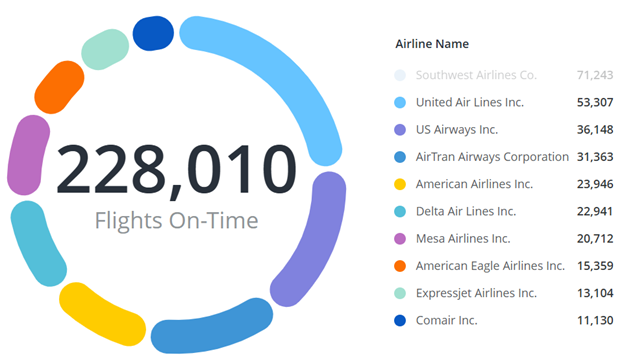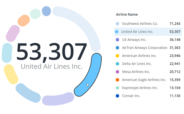To display a segment's information in the label, click the segment. The selected segment is highlighted in the legend. In the example below, United Air Lines is selected in the donut, so the its name and number of on-time flights (53,307) display in the middle. This provides a better understandng of the data.