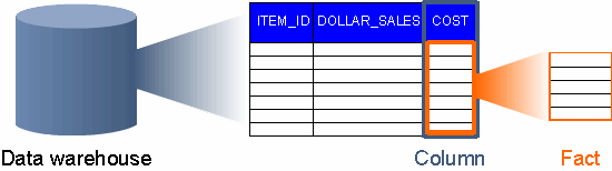 Facts are stored in the data source in fact tables. These fact tables are composed of different columns. Each cell in the columns represents a specific piece of information. When fact information is requested for a report, that column is accessed to retrieve the necessary data. This data is used to create a metric (such as profit) which is a business measure.