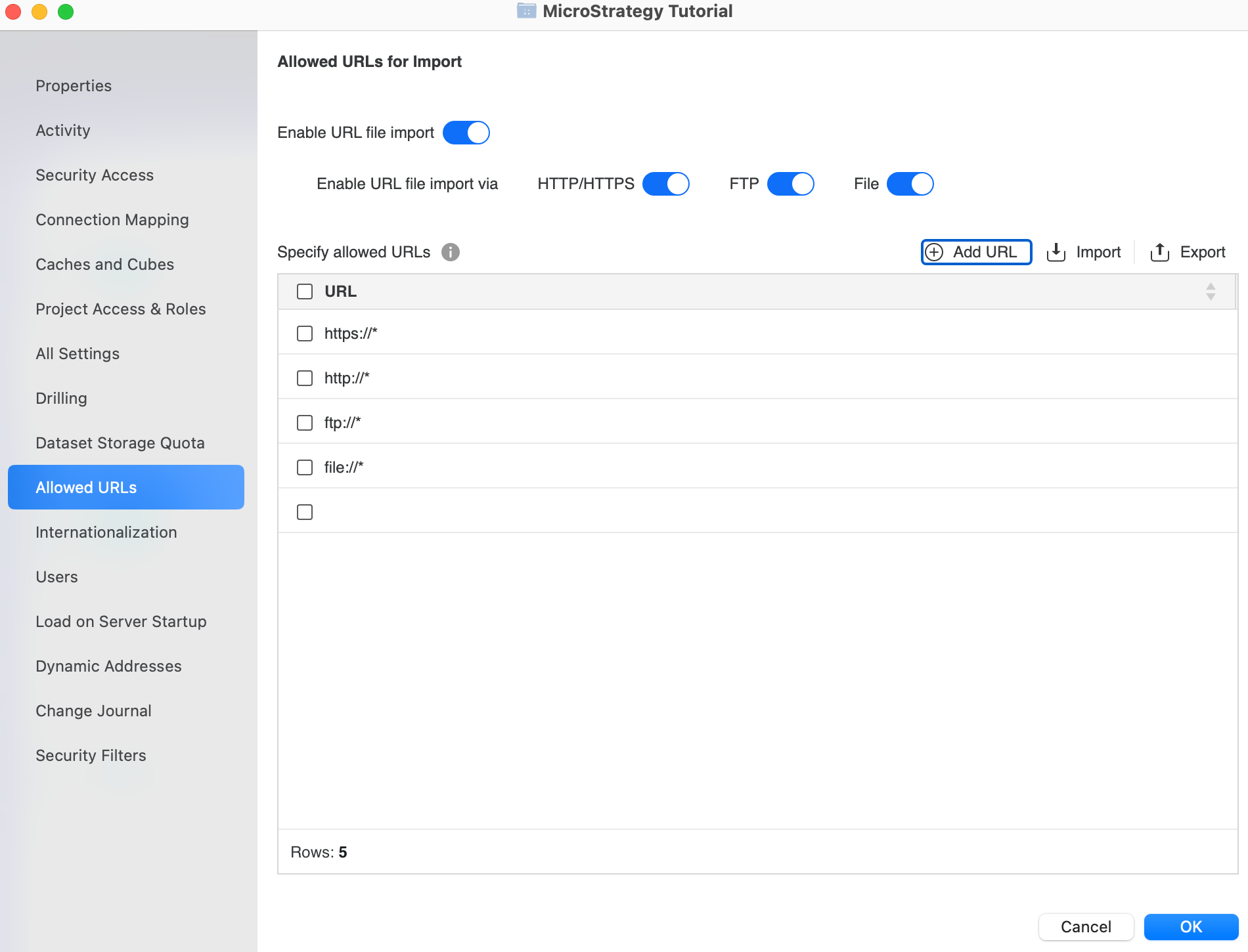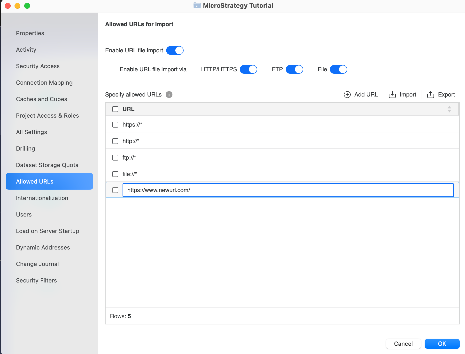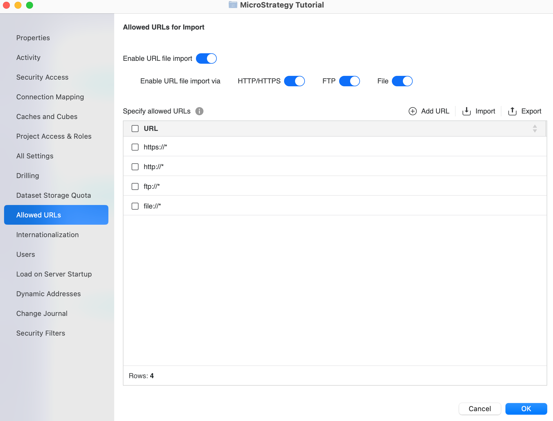 Starting in MicroStrategy ONE Update 11, administrators can restrict the URLs users can use to import data into Strategy.