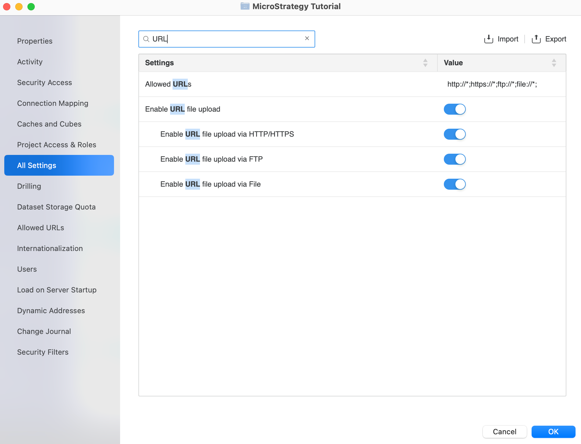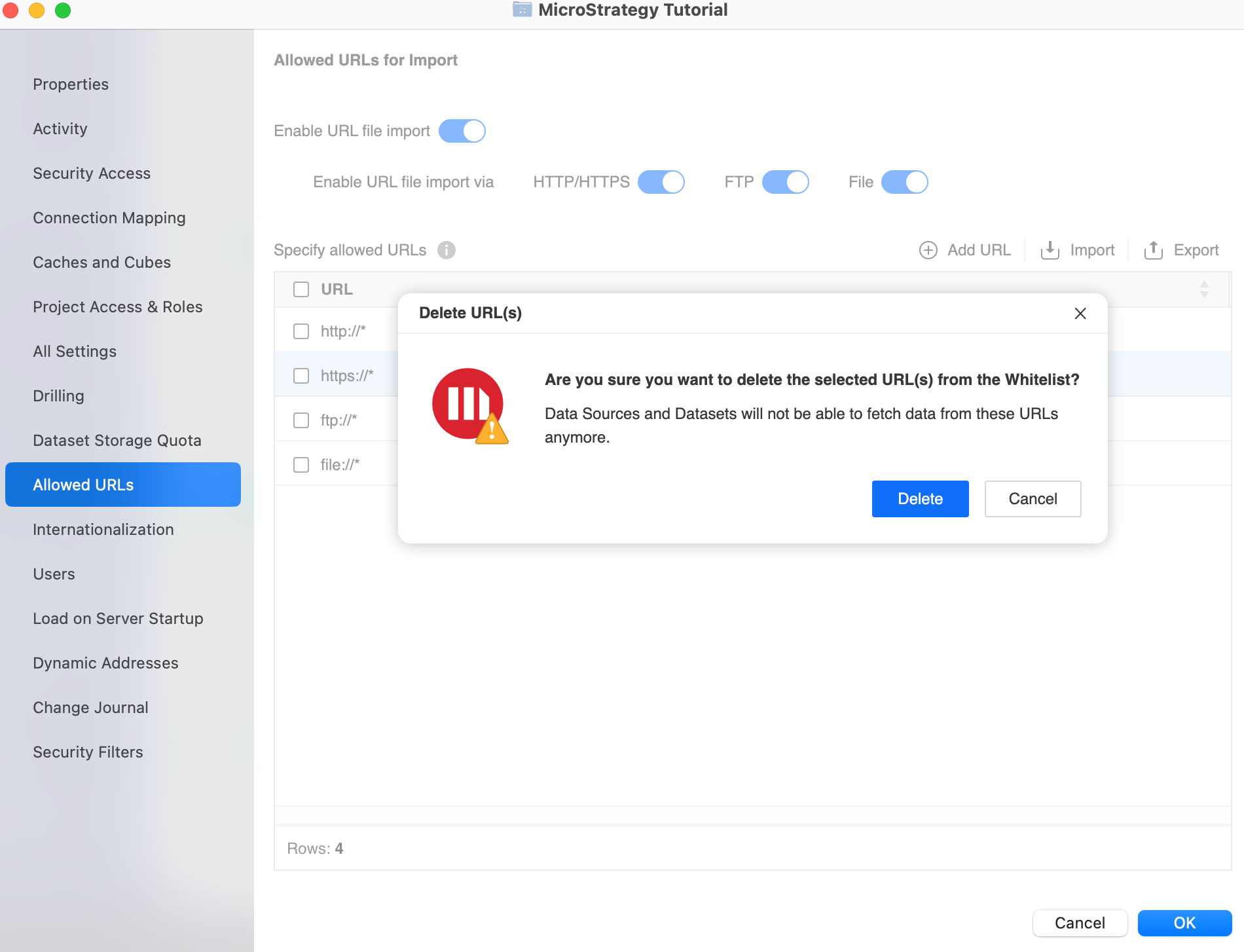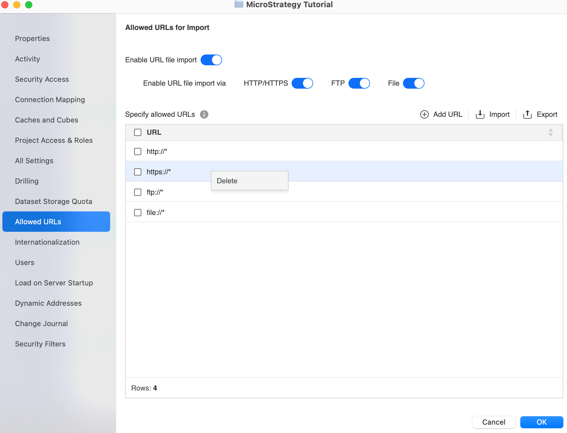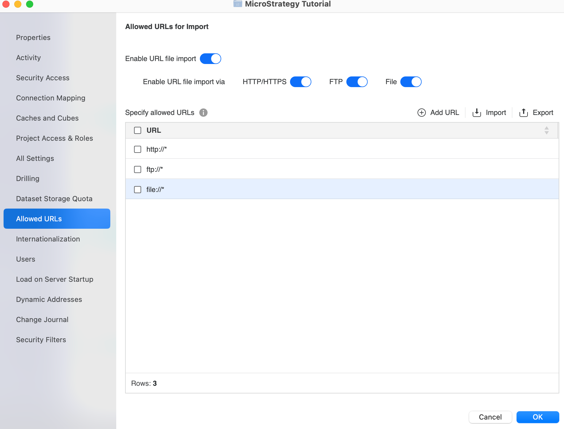 Starting in MicroStrategy ONE Update 11, administrators can restrict the URLs users can use to import data into Strategy.