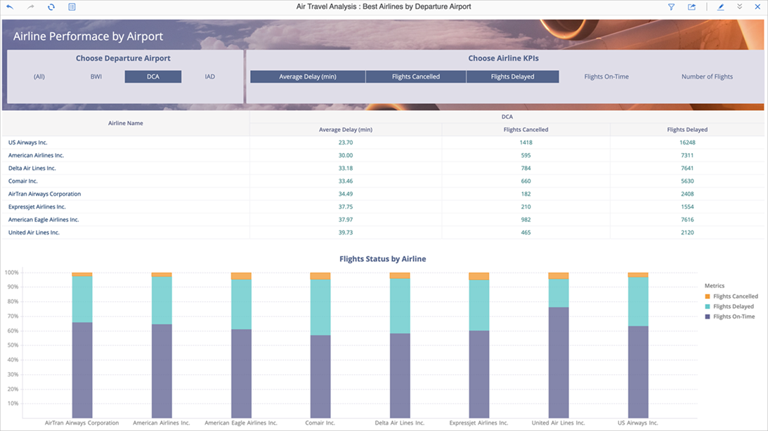 A dashboard is an interactive display that you can create to showcase and explore business data. You can add visual representations of the data (that is, called visualizations) to the dashboard to make your data easier to interpret, perform manipulations on the data to customize which information to display, and organize data into multiple chapters and pages to provide a logical flow to your dashboard. You can quickly and easily create a polished dashboard without requiring a lot of design time.