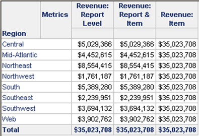 If the report level is removed, only the level explicitly set on the metric affects the metric calculation, regardless of what the report contains. For example, remove the report level from the revenue metric described previously. Place this metric on a report with the Region attribute and two other revenue metrics, one with report level only and the other with report level and item. The report results are shown below.