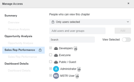 For example, in the image below, Developers, Everyone, Public / Guest, Administrator, and MSTR User have inherited access to the dashboard. You can restrict access to the Sales Rep Performance chapter for Everyone and Public / Guest. Because Developers, Administrator, and MSTR User have write and view access, you cannot restrict access to the chapter.