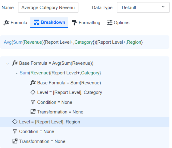 The inner formula, Sum(Revenue), calculates the revenue at the Category level. The outer formula then calculates the average of the resulting values at the Region level. In the Metric Editor, the inner formula appears as a child of the outer formula, as shown below: