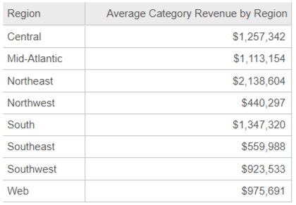 The following report uses the above metric to display the average category revenue for each region.