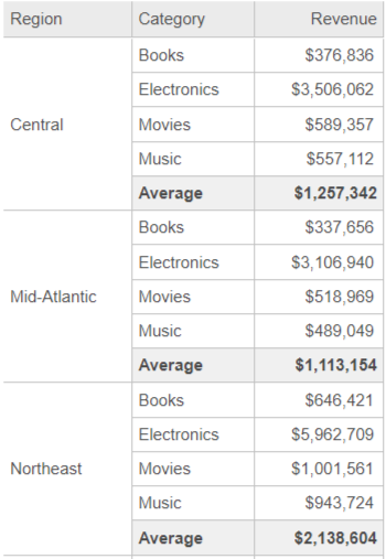 This is similar to creating a report that calculates the revenue by category for each region, and then enabling the Average subtotal, as shown below. The value of the Average subtotal is reflected in each row of the previous report, that is, Central region's Average Category Revenue by Region is $1,257,342 in both reports.