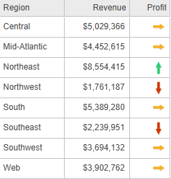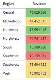 A report displays revenue data for different geographical regions. Use thresholds to display revenue values less than $3,500,000 in red, greater than $5,000,000 in green, and the rest in yellow. You can do the same in a grid visualization on a dashboard, as shown in the image below.
