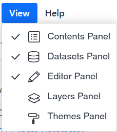 From the View menu, select the panels to display. Checked panels indicate the corresponding panel is open.