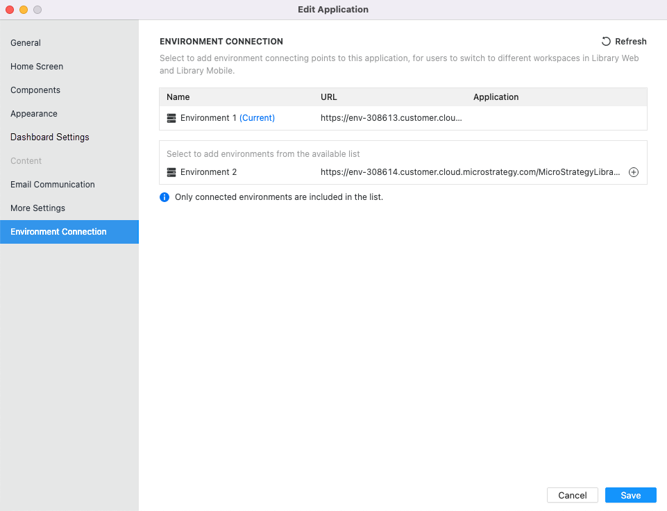 Starting in MicroStrategy 2021 Update 9, you can enable access to multiple environments in Library Web.