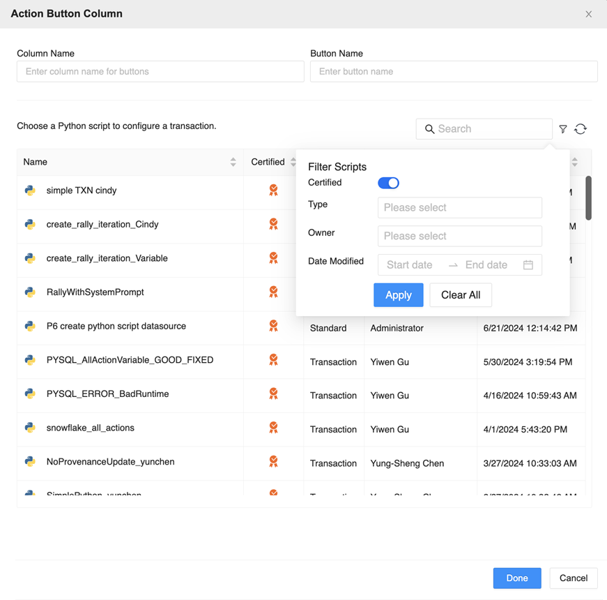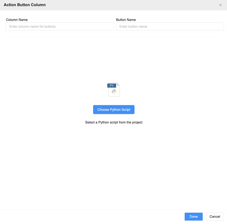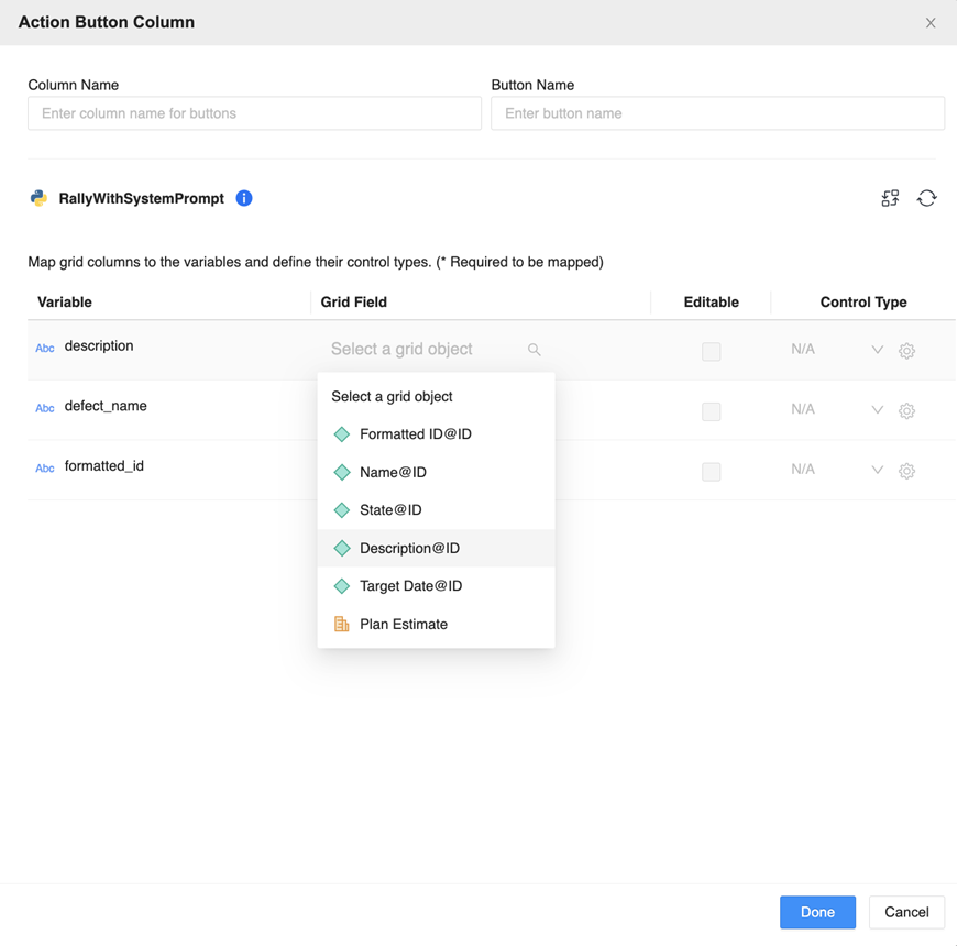 Depending on the action the creator wanted the button to trigger, you can select a standard Python or transaction Python script. For both script types, map the grid columns to variables.