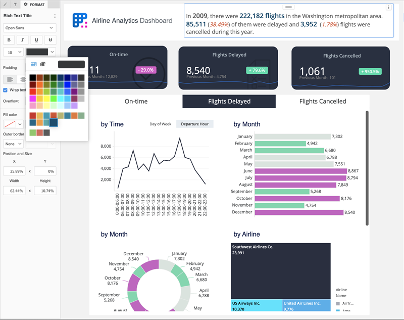 Unlike regular text fields, you can use rich text to apply rich formatting to the individual character level to create compelling infographic style dashboards.