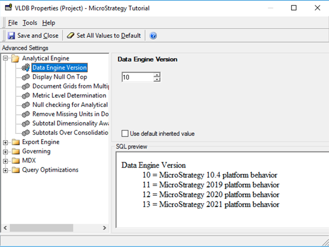 For customers migrating from one platform release to the next, MicroStrategy 10.4.x to Strategy One for example, the cumulative effect of the changes can have a large impact on your execution results. To minimize these impacts when performing a platform release upgrade, Strategy Workstation allows you to choose the data engine version for each project in your environment.