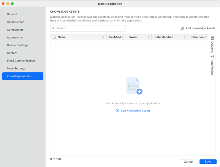 After a knowledge asset is created, uploaded and certified, application administrators can attach these to specific applications. Attaching a knowledge asset at the application level ensures that its benefits and insights are accessible across all dashboards and bots operating within that application, thereby standardizing responses and enhancing decision-making consistency throughout the application ecosystem
