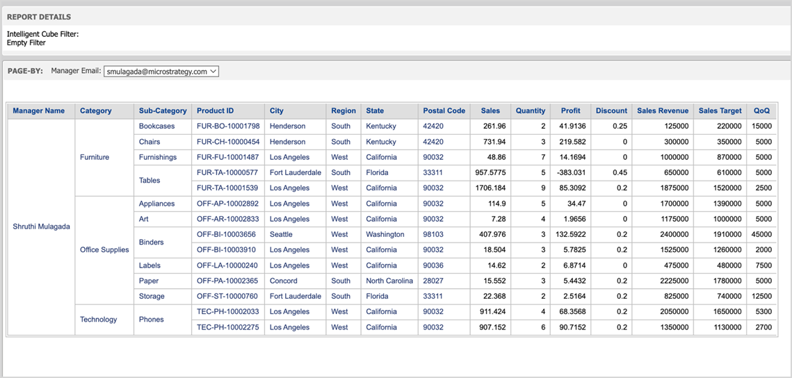 Consider an example where you must schedule a sales report to all store managers in your organization. Add your store managers' email attribute on the page-by section of the report to slice the data by each store. Create an email subscription with bursting enabled, which delivers content to the stores with a relevant data view based on the page-by email attribute.