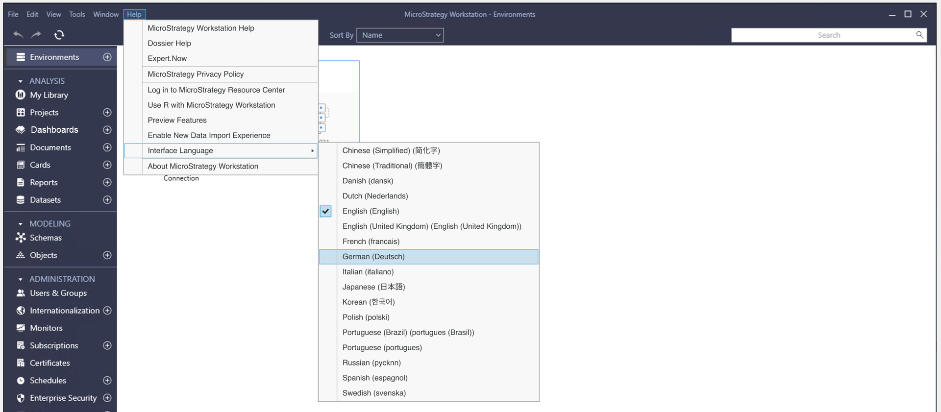 Starting in MicroStrategy ONE Update 11, Microsoft Windows users can update the Workstation interface language to a language that is different from the system settings.
