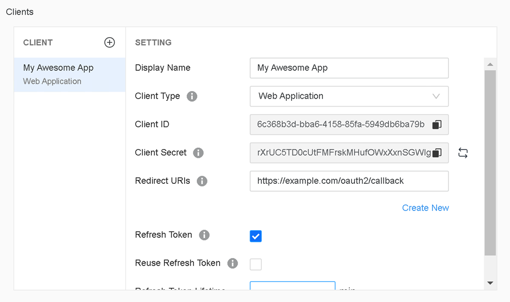 - Refresh Token Lifetime: Enter a value in minutes for the refresh token time span.