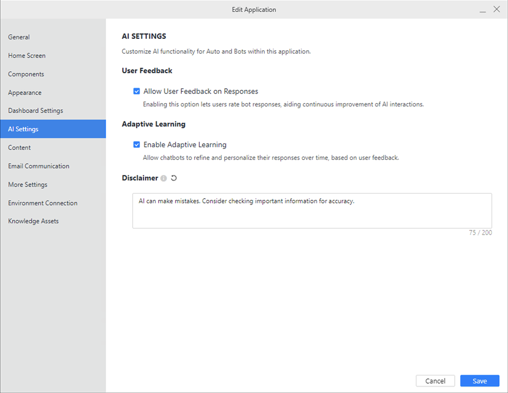 To enable adaptive learning for Auto Answers, select the check box next to Enable Adaptive Learning.